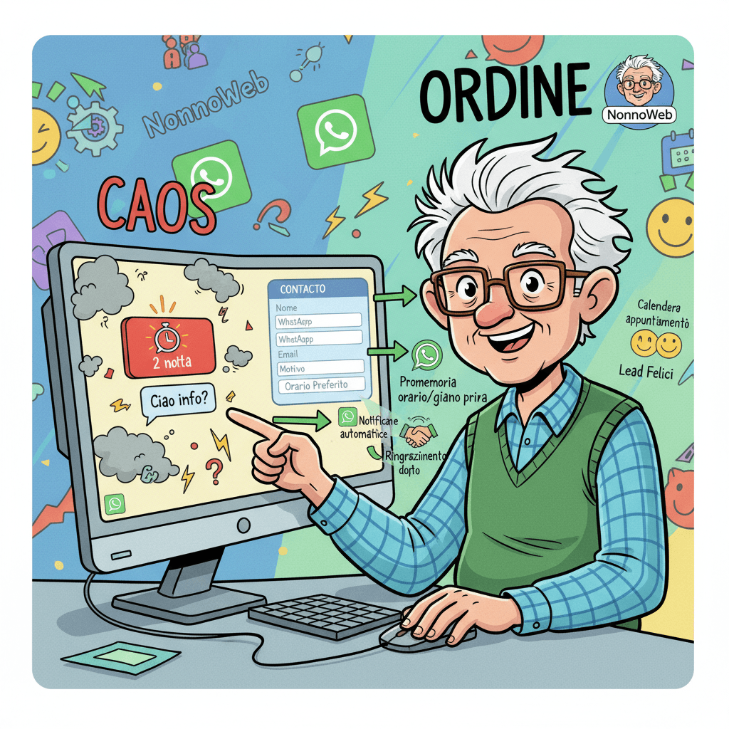 Quale NonnoWeb, ho girato il web e ho trovato qualcosa di molto più efficace: un mini form prima della chat WhatsApp, come uno strumento magico che ti trasforma un semplice click in un vero lead, con informazioni precise e organizzate.